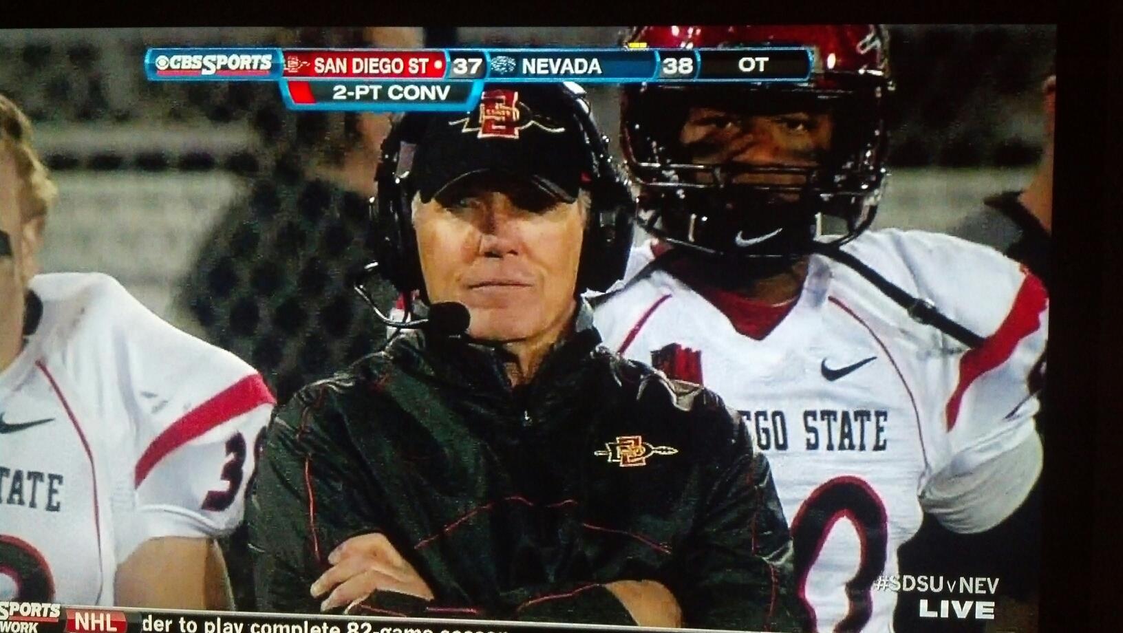The Nevada offensive could not be stopped as the Wolf Pack would score on their first possession of overtime. The Aztecs would get the ball and would soon score on a 21 yard touchdown pass from Aztecs back up quarterback Adam Dingwell to Gavin Escobar. Rocky Long went to the famous chart and said we cannot stop the Wolf Pack so let’s go for the win and win the Aztecs did. The Aztecs won on a two-point conversion pass from Adam Dingwell to back up tight end Adam Roberts. The Aztecs are now 4-1 in program history in overtime.