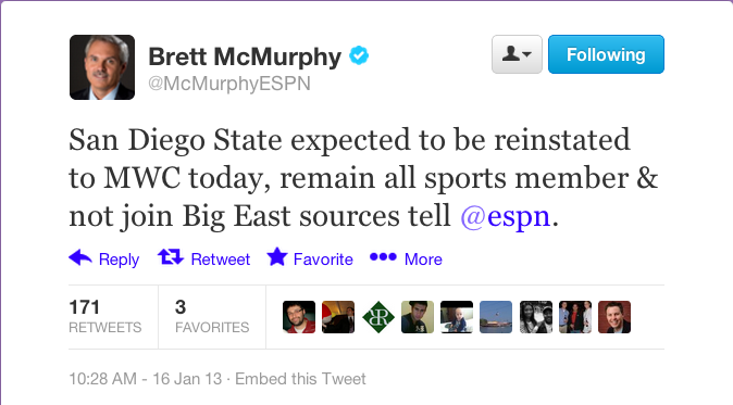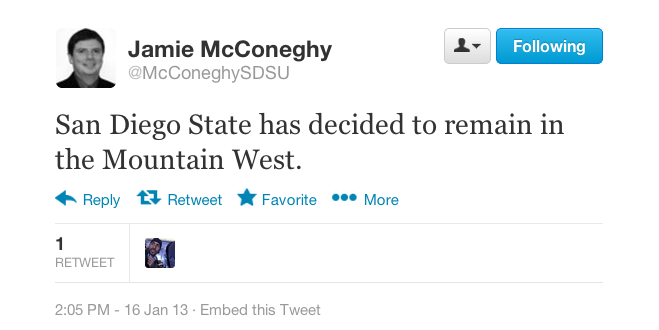 Source: expect a news conference some time this week as #SDSU will remain in the #MWC. Working on the story now.