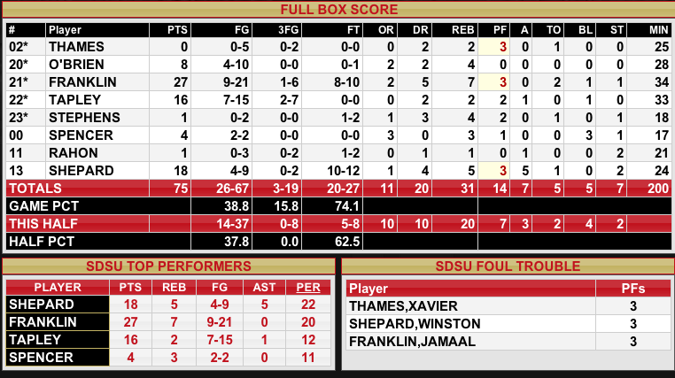 Winston Shepard shot 9 out of 10 from the free throw line in the first half of the game. That landed Shepard into double figures for just the second time this season. Shepard has been the most noticeable Aztecs in the first half as he is stone walling his former teammate Bennett from Findley Prep. The Aztecs were playing horrible defense in the first half of the game allowing UNLV to come away with easy layups. The Aztecs had the same problem with a very good rebounding team in Colorado State. The Aztecs had been out-rebounded 22 to 11 in the first half of the game. The Aztecs ended the first half shooting 12-30 (40%) from the floor, 3-11 (27.3%) from beyond the arc and 15-19 (78.9%) from the free throw line. The player of the first half for SDSU was Jamaal Franklin who scored 17 points and had 5 rebounds.