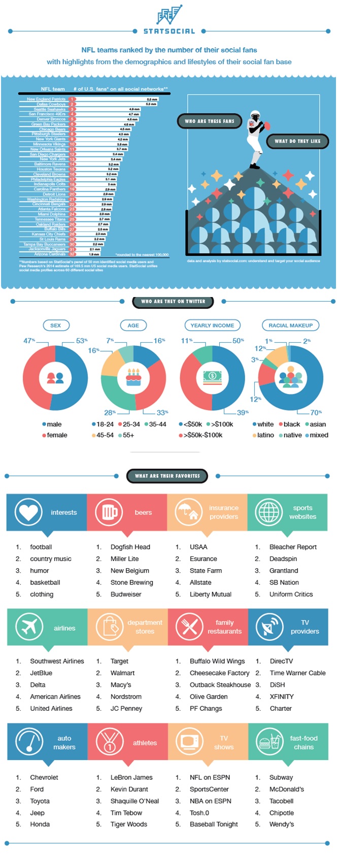 StatSocial created a really cool info graphic on the NFL. StatSocial compiled the data from this info graphic by looking at over 50 million social media users across 60 different social sites. Here are some examples of what kind of into you will find in the info graphic. The gender, age, yearly income, and racial background of NFL fans. Also the fans’ top five favorite beers, sports websites and athletes. For a bigger graphic please click on this StatSocial_NFL