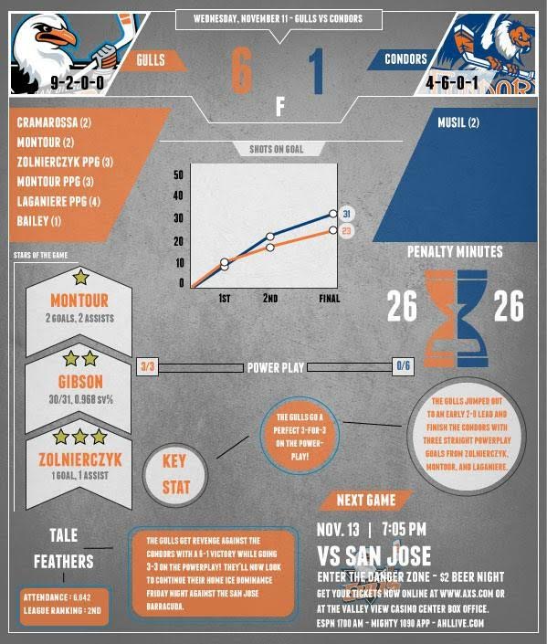 The Gulls pounded the Condors 6-1, with a 5-0 lead for most of the game. All around, the team looked the best they have all year. They displayed puck control, passing, and scored on the power play each time they went up (3-3) which is somewhere our offense has been lacking. The Gulls were “outshot” 31-23, but John Gibson was simply amused with the Bakersfield shots. Gulls Goal scorers: