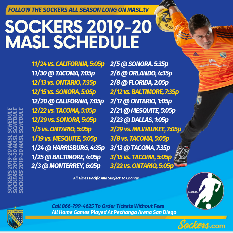 SAN DIEGO (Monday, September 30, 2019) — The Major Arena Soccer League (MASL) today announced the 2019-20 regular season schedule. The Sockers will open their season on Sunday, November 24 against the California Express. Defending MASL champions Milwaukee, the eight-time indoor champions Baltimore, as well as Western Conference finalists Monterrey and Sonora, highlight a schedule filled with top opponents.